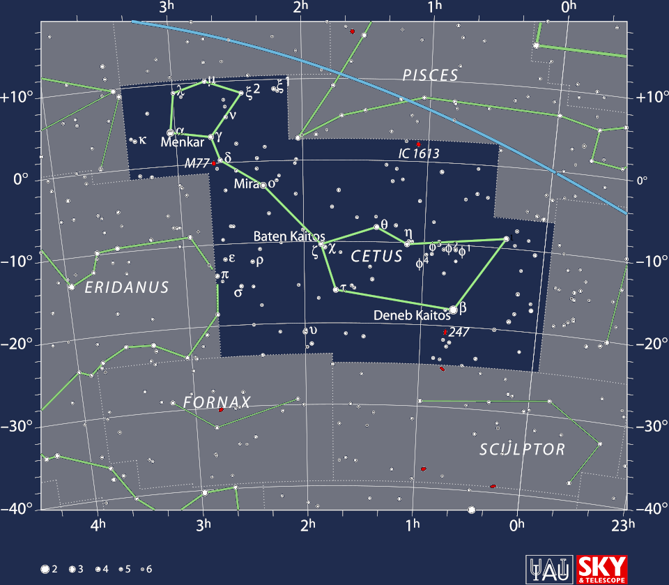 Mira, ovvero Omicron Ceti, stella variabile (tra 2 e 10 di magnitudine apparente) distante da noi 418 anni luce, è la stella più nota della costellazione. La sua scoperta, ad opera di David Fabricius nel 1\596, fu il primo colpo al dogma dell’immutabilità dei cieli.